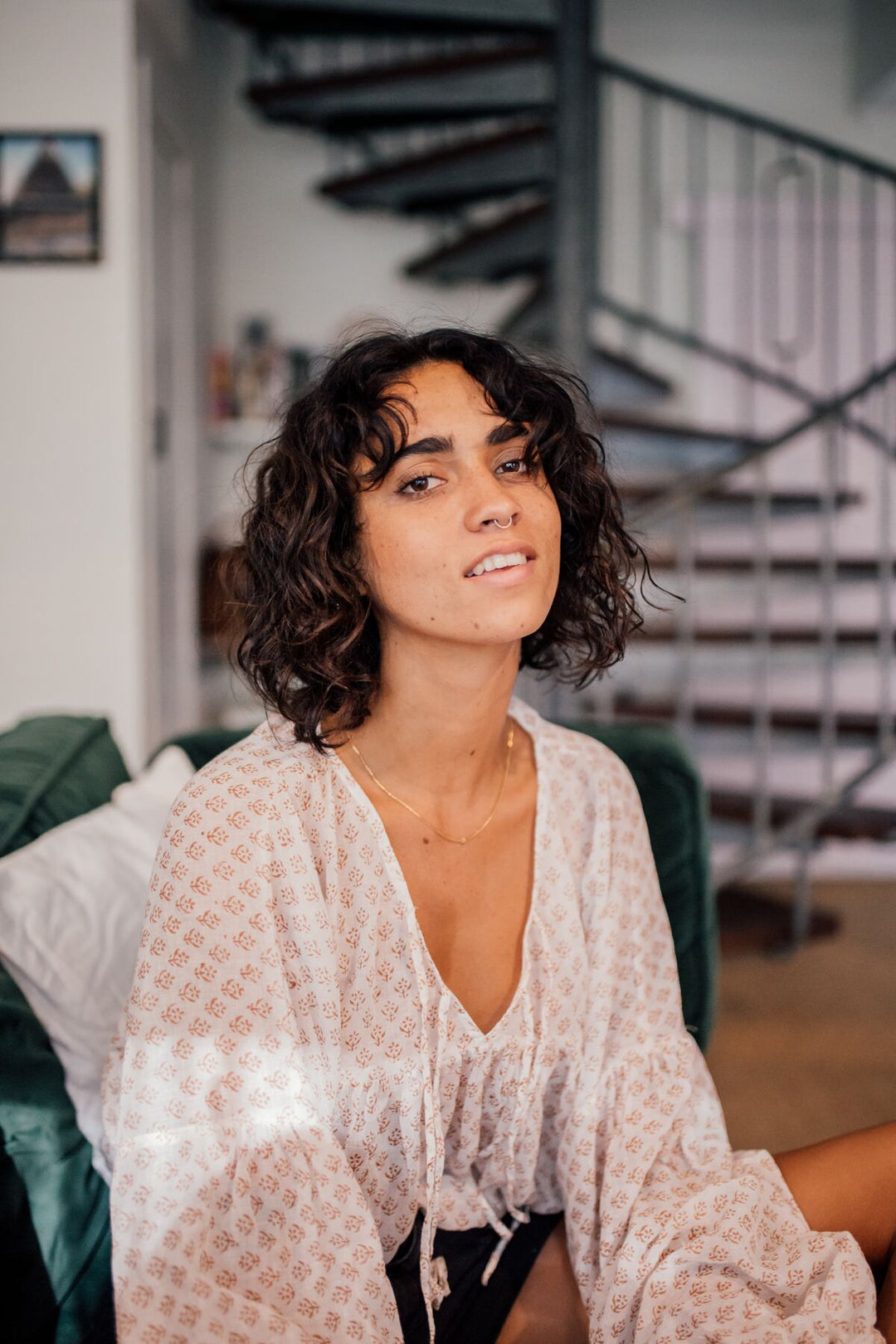 This divine cotton blouse is as light as can be. With the most romantic billowed sleeves, elastic cuffs, and two optional ties at the front. The flowing fabric features a sweet floral classic Indian Buti block print in cinnamon on soft white cotton. A timeless feminine piece.