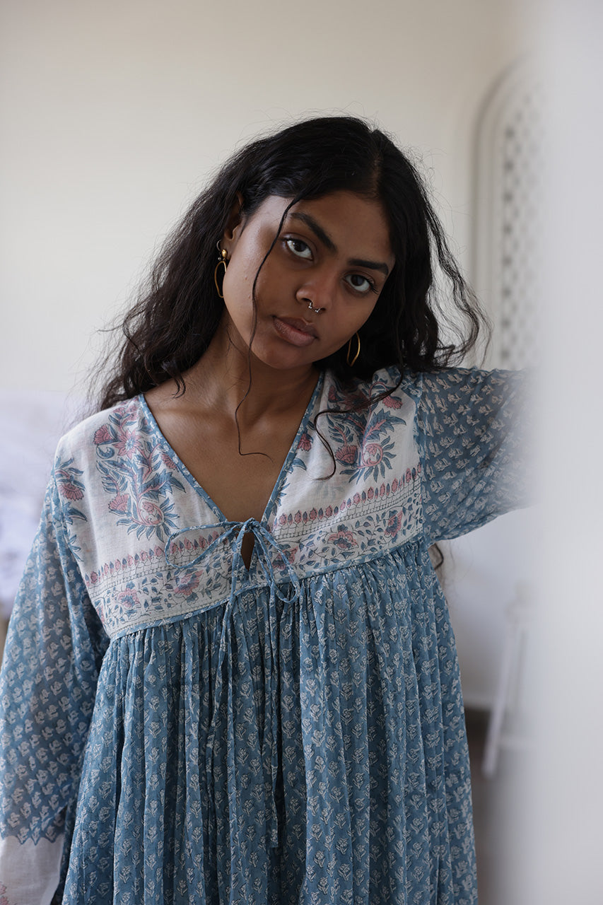 The Rooh Maxi Dress in Heritage Blue truly romanticises the magic inherent in hand-block printed fabric. This captivating floor-length style neatly finished with a bottom tier ensures a perfectly flowing feminine silhouette in gorgeous colours of blue with pink accents on a white base. Featuring delicately extravagant blouson sleeves with an elasticated cuff, a sweet front tie, and midi-length cotton underlining.