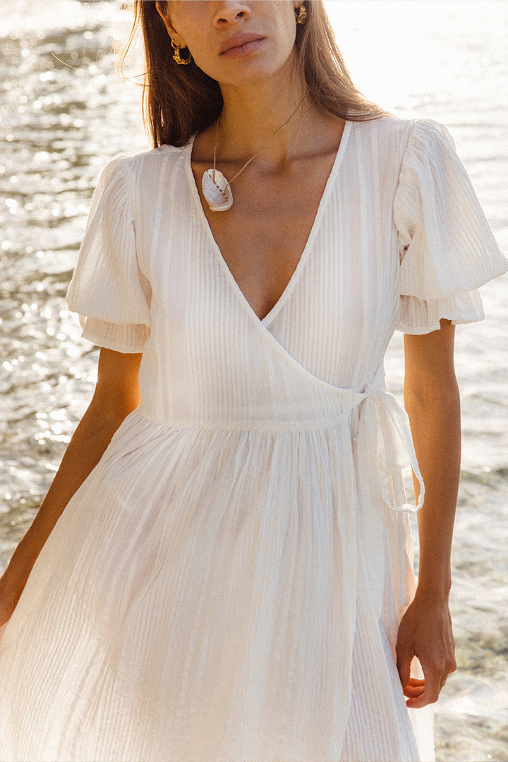 The Uma Maxi Dress is a classic piece slowly and ethically handcrafted from 100% cotton with soft textured stripe detailing. This self-adjustable wrap design provides the perfect balance between a casual and styled look with the special addition of pockets and cute ruffle sleeves for an elegant finish.